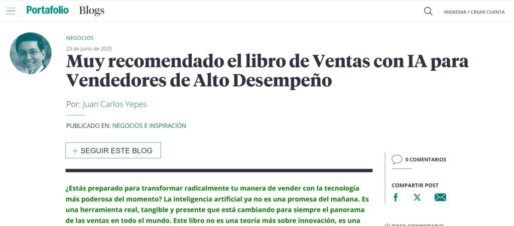 - El periodista Juan Carlos Yepes ha recomendado mi libro: Ventas con IA para Vendedores de Alto Desempeño en el blog de Portafolio.co, un medio de comunicación referente en economía y negocios. El artículo se llama Muy recomendado el libro de Ventas con IA para Vendedores de Alto Desempeño.