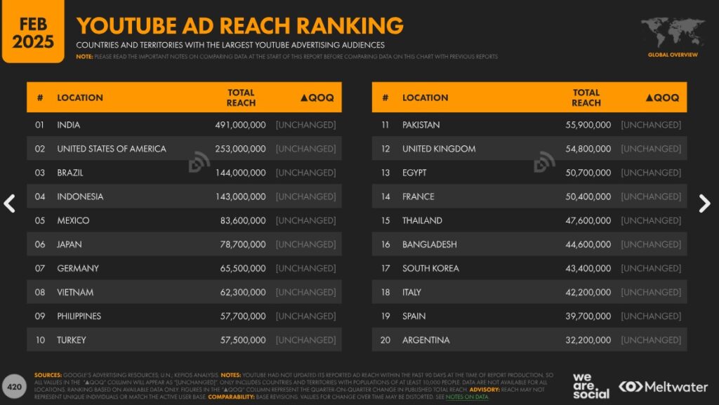 En cuanto a los 20 países de más usuarios de YouTube solo aparecen Brasil, México y Argentina.