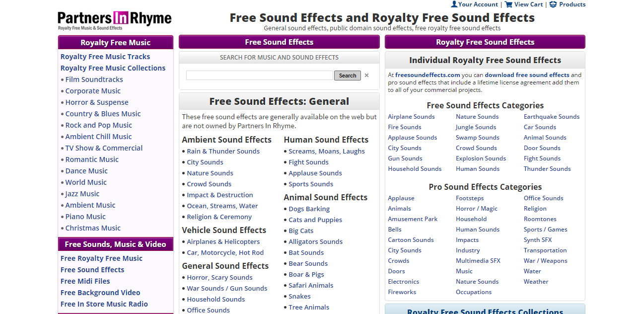 La mayoría de efectos de este sitio tiene un costo menor, pero tiene una pequeña librería con efectos gratuitos y están divididos en 3 categorías: obtenidos de otros sitios web, libres de derechos y bajo dominio público. Los archivos están disponibles en formato WAV