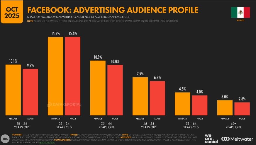En cuanto a adopción, el alcance publicitario de Facebook en México equivalía al 70,7 % de la población total al cierre de 2025. Si se considera únicamente a la audiencia elegible, es decir, personas mayores de 13 años, el 89,1 % utilizaba Facebook en ese momento. Aún más llamativo es que, según los datos de la compañía, el 99,5 % de los adultos mayores de 18 años en México usaban Facebook a finales de 2025. Como referencia adicional, el alcance publicitario de la plataforma representaba el 84,7 % del total de usuarios de internet del país en octubre de 2025.