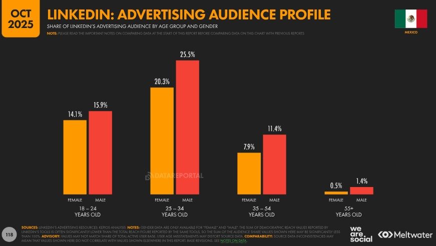 Dado que LinkedIn solo permite el uso de la plataforma a personas mayores de 18 años, resulta más representativo señalar que su alcance publicitario llegaba al 31,0 % de la población adulta del país en ese mismo periodo. Como referencia adicional, el alcance publicitario de LinkedIn en México representaba el 26,3 % del total de usuarios de internet, independientemente de la edad.