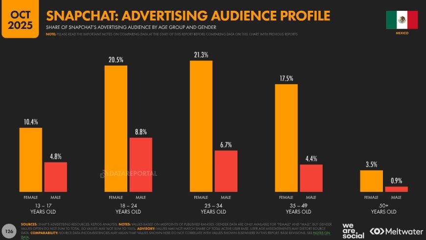 No obstante, dado que Snapchat solo permite el uso de la plataforma a personas mayores de 13 años, resulta relevante destacar que el 14,1 % de la audiencia elegible en México utilizaba Snapchat en ese periodo. Asimismo, los datos de la compañía indican que el 13,4 % de los adultos mayores de 18 años en el país usaban la plataforma a finales de 2025.
