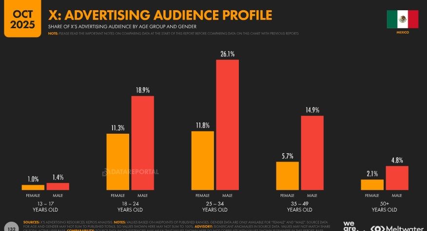 Dado que X solo permite el uso de su servicio a personas mayores de 13 años, los datos más recientes sugieren que el 15,6 % de la audiencia elegible en México utilizaba la plataforma al momento de la elaboración del informe. Asimismo, la información publicada en las herramientas publicitarias de la compañía indica que el 16,7 % de los adultos mayores de 18 años en el país usaban X a finales de 2025.