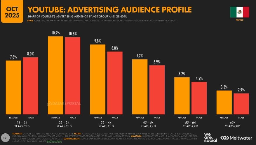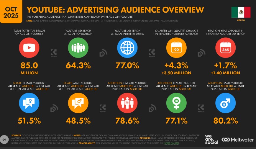 Con esta consideración, los datos de la propia compañía indican que el alcance publicitario de YouTube en México equivalía al 64,3 % de la población total al cierre de 2025. Para poner estas cifras en contexto, los anuncios en YouTube alcanzaban al 77,0 % del total de usuarios de internet en el país en octubre de 2025, independientemente de la edad.