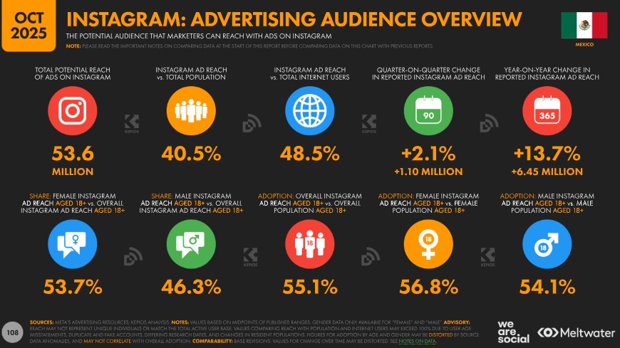 Según los datos publicados en los recursos publicitarios de Meta, Instagram contaba con aproximadamente 53,6 millones de usuarios en México a finales de 2025. Al igual que ocurre con Facebook, es importante tener en cuenta que Meta actualiza y revisa de forma periódica la manera en que reporta el alcance de audiencia en sus herramientas publicitarias, por lo que estas cifras pueden no ser completamente comparables con las de informes anteriores.