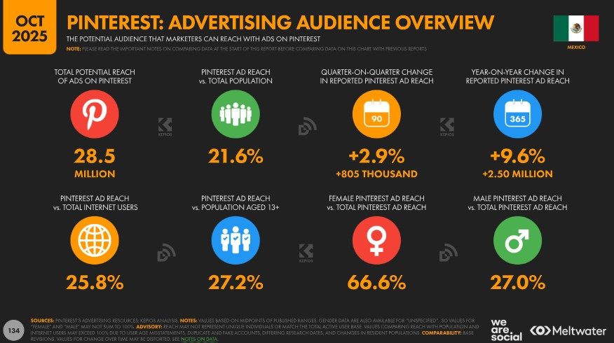 Dado que Pinterest solo permite el uso de su plataforma a personas mayores de 13 años, resulta útil señalar que el 27,2 % de la audiencia elegible en México utilizaba Pinterest a finales de 2025. Como referencia adicional, el alcance publicitario de la plataforma representaba el 25,8 % del total de usuarios de internet del país, independientemente de la edad.