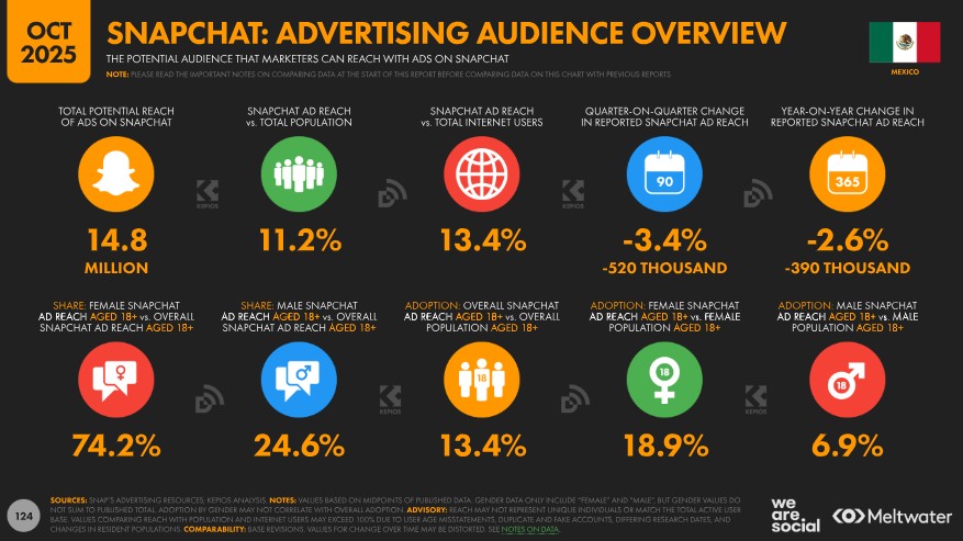 Como referencia adicional, el alcance publicitario de Snapchat en México representaba también el 13,4 % del total de usuarios de internet, independientemente de la edad, lo que confirma que se trata de una red con una penetración más limitada en comparación con otras plataformas sociales de gran alcance en el país.