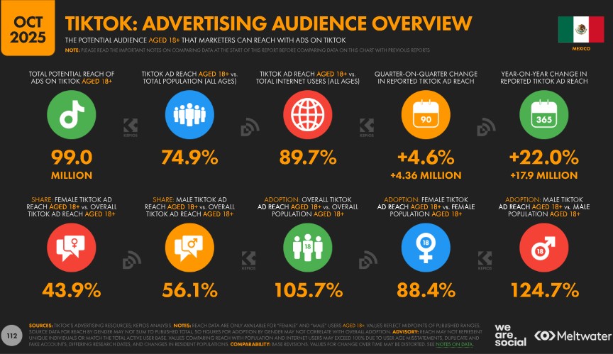 Como referencia adicional, el alcance publicitario de TikTok en México equivalía al 89,7 % del total de usuarios de internet del país, independientemente de la edad, lo que confirma la elevada penetración de la red social dentro del ecosistema digital mexicano.