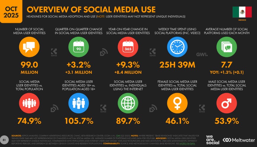 Según un análisis propietario realizado por Kepios para DataReportal, en octubre de 2025 México registraba 99,0 millones de identidades activas de usuarios en redes sociales. Esta cifra equivalía al 74,9 % de la población total del país a finales de 2025, lo que confirma la alta penetración de las plataformas sociales en el mercado digital mexicano.