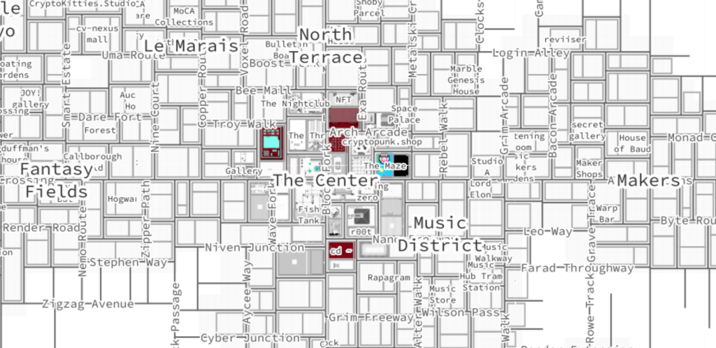 Cryptovoxels es un metaverso descentralizado construido también sobre la cadena de bloques ethereum. Consiste en una ciudad llamada Origin City, que tiene calles que son propiedad de The Corporation y parcelas que son propiedad de personas individuales que las compran.