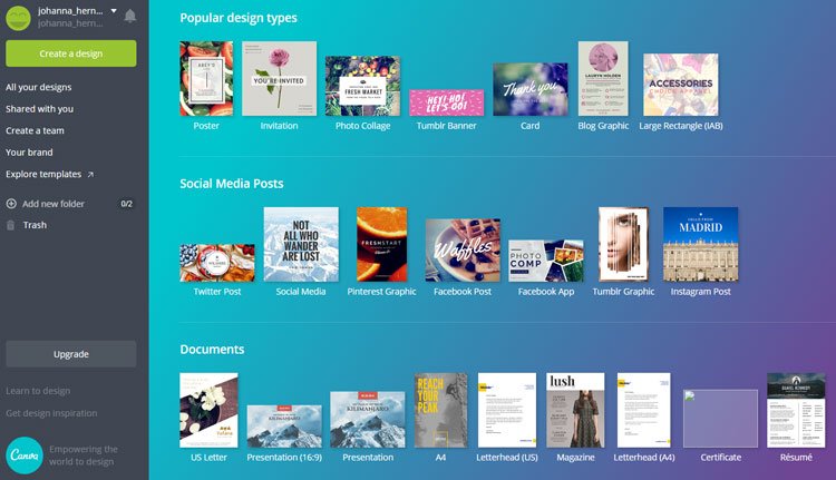 Canva es una excelente plataforma de diseño de contenido, te ofrece una amplia lista de plantillas para crear piezas gráficas como posters, invitaciones, posts para redes sociales, banners, infografías, entre otros.  También te ofrece tutoriales y tips para mejorar tu contenido.